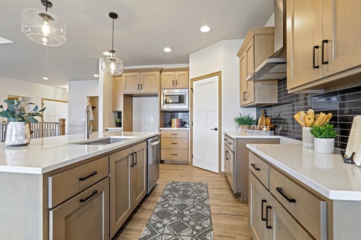 Following the living room, we move into the kitchen. You will see a great amount of cabinet and counter space. Your eye will be drawn to the beautiful black tile backsplash. In addition to everything else, this floor plan features a large walk in pantry for the majority of your food storage!