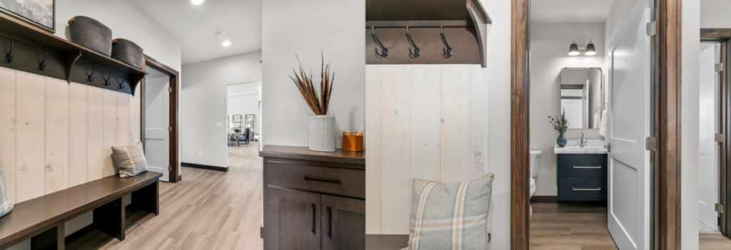 Another great feature of the home is the elegant entry from the garage, which is a perfect area for dressing appropriately for any weather. There is a comfortable bench, as well as stylish coat hooks for storage.