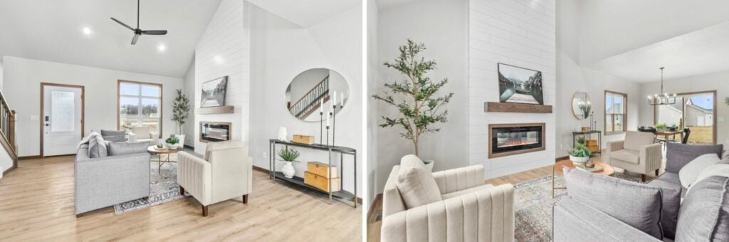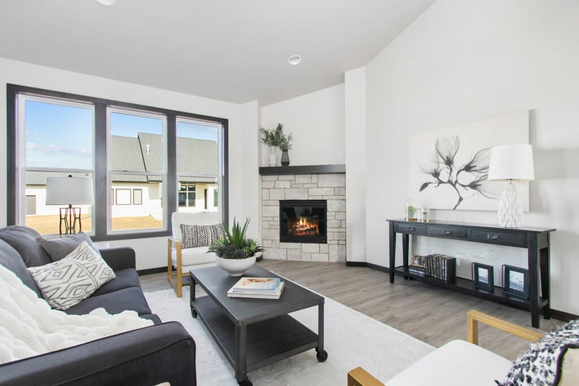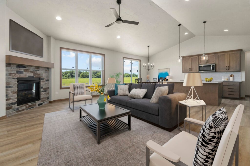 This Daylily home has a beautiful floor to ceiling fireplace as a center point in the living room. The cathedral ceilings make this room open and airy, and the fireplace adds to the clean and modern look.