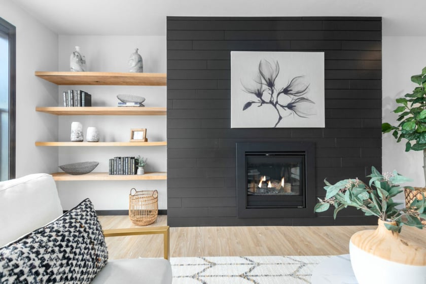 We love the look of this all-black fireplace in our Elm home. The square firebox gives the home a modern feel.