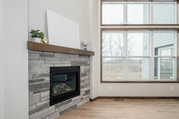 This square firebox makes this fireplace stand out beautifully with the black mantel tying together perfectly with the windows and trim in this Hawthorne home.