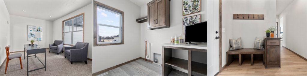 As you step into the home from the foyer, you will find a home office or a flex room on your right. Another wonderful bonus room off of the garage entrance is the laundry room. These extra bonus rooms provide designated areas for laundry, an office, or a playroom.
