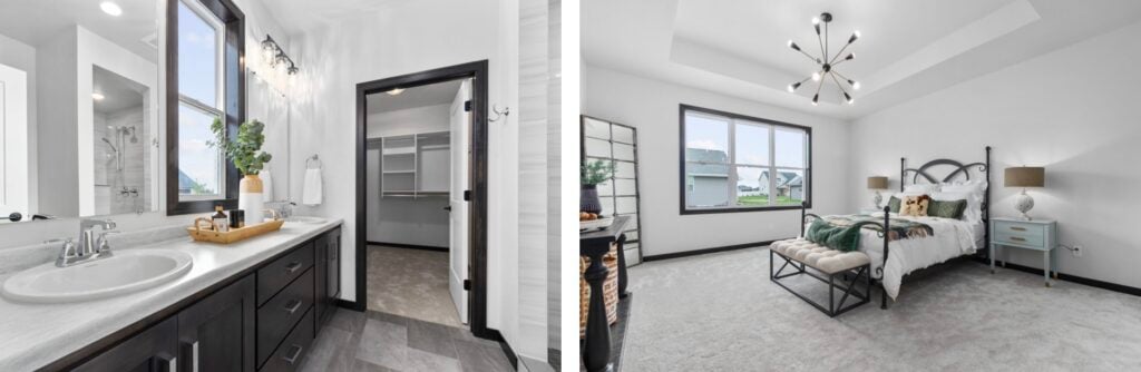 The master bedroom is a spacious and bright retreat with multiple windows that let in natural light. The master bathroom is a spa-like oasis with a double sink vanity and a large walk-in closet.
