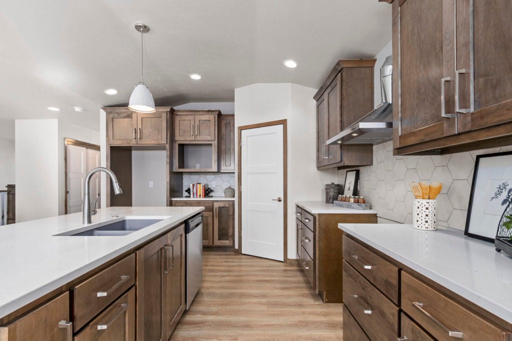 Moving onto the kitchen and dining area, you will see the large kitchen island equipped with tons of storage and multiple cabinets, and a large pantry to provide infinite storage.