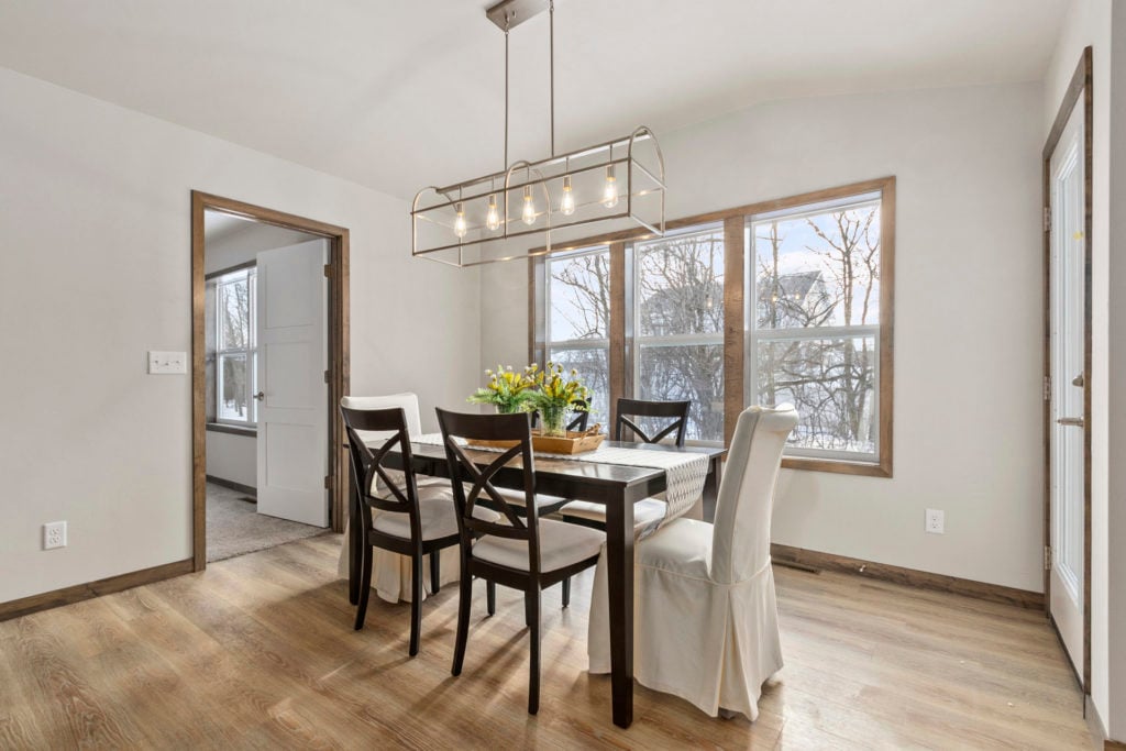 The dining area is located directly off the kitchen, allowing easy access when entertaining guests or preparing dinner. This dining area includes large windows that bring natural light into the kitchen and dining spaces.