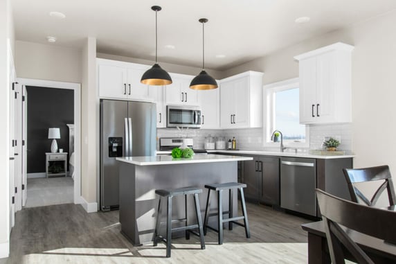 Moving into the kitchen, the dining area has lots of space for many different types, sizes, and styles of tables to fit your needs! This kitchen features ample amounts of counter and cabinet space, as well as a gorgeous kitchen island and tile backsplash. And the best part is a large walk-in pantry!