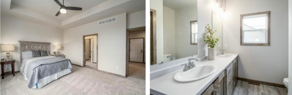 The master bedroom and bathroom are large open-concept rooms with plenty of space to add your own personal touches. The master bedroom features a beautiful sliding barn door that leads to the bathroom. The bathroom includes a gorgeous tile shower, dual sinks, and a large walk-in closet. What more could you possibly need? This floor plan is minimal while still holding everything you need within a home & more!