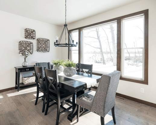 Located directly off the kitchen, we have the dining area. This allows for easy access into the kitchen when entertaining guests or getting dinner ready. Having those large windows brings gorgeous natural lighting into the dining and kitchen spaces.