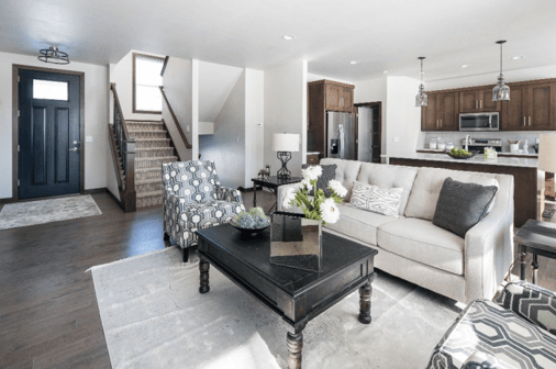 When entering the home through the foyer, you will be looking out to the open living, dining, and kitchen. A great thing about this open concept floor plan is that it allows a cohesive flow from one space to the next.